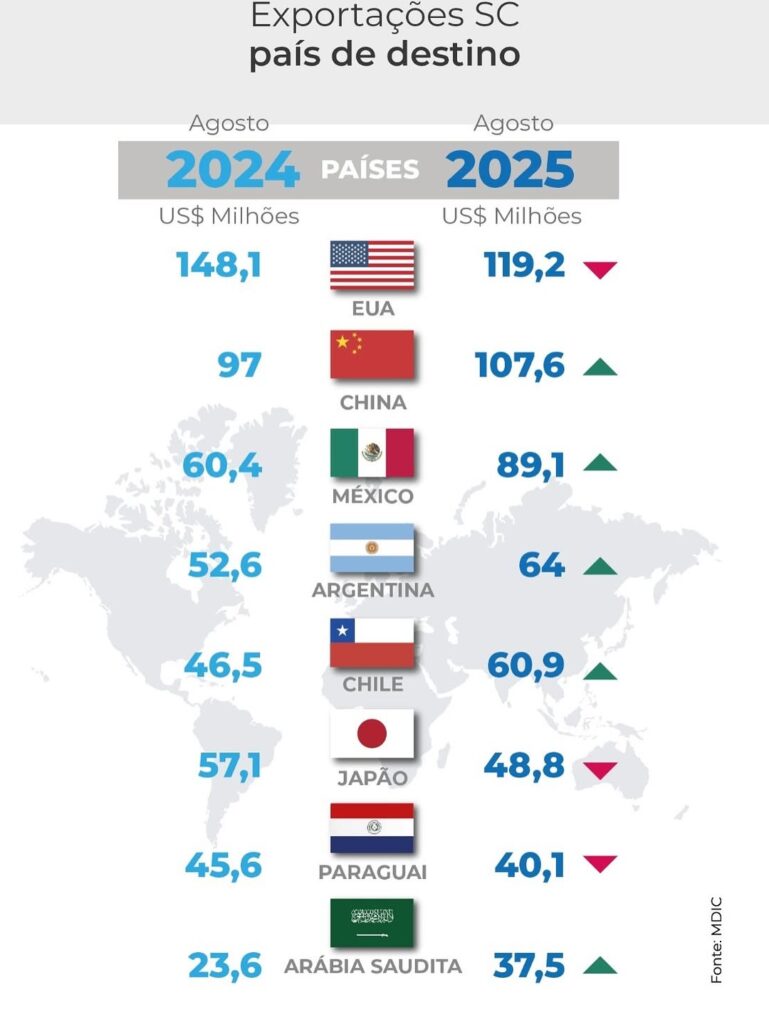 O peso da queda foi compensado por outros destinos: China, México, Argentina, Chile e Arábia Saudita ampliaram as compras de produtos catarinenses.