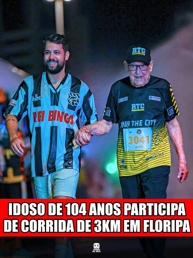 Pensa num exemplo de garra môquiridu! Seu Ênio, de 104 anos, participou da Corrida do Fogo dos Bombeiros em Floripa neste sábado (20) e mandou ver nos 3 km da Beira-Mar Continental! 🔥👟👏