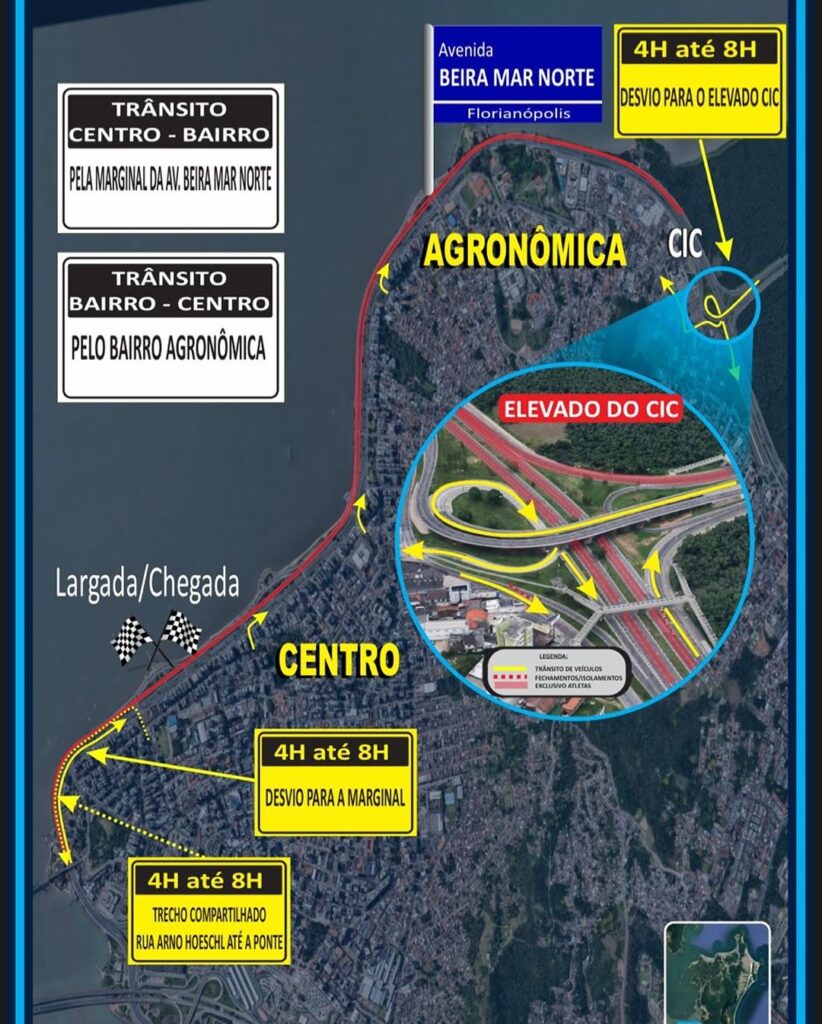 Quem for do Centro pro Norte vai ter que usar as marginais. Já quem vem no sentido bairro-Centro precisa passar pela Agronômica. Perto da ponte, o trecho entre a Rua Arno Hoeschl e a entrada vai ser compartilhado entre carros e corredores.