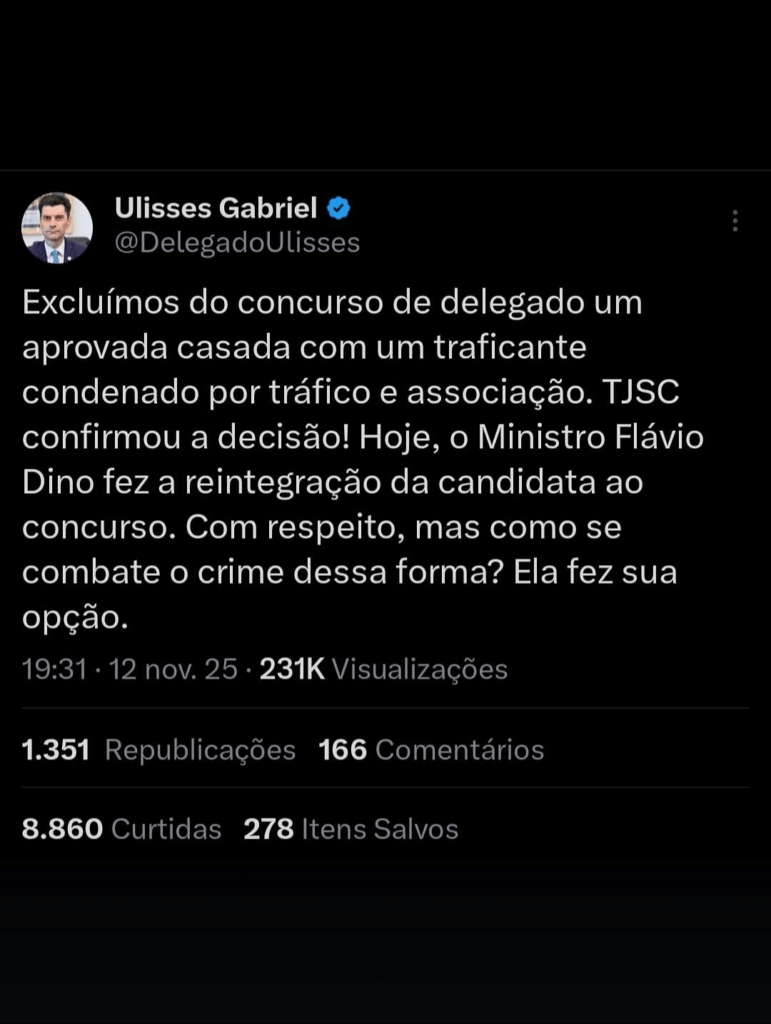 O ministro Flávio Dino decidiu que Lays Lopes Carneiro Barcelos, candidata ao concurso para delegado da Polícia Civil de SC, deve voltar para o processo seletivo. Ela tinha sido eliminada na investigação social porque é casada com um homem condenado por tráfico de drogas.