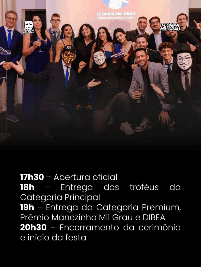 A partir das 17h30 abrimos oficialmente o evento. Às 18h iniciamos a entrega dos troféus da Categoria Principal e, às 19h, seguimos com a Categoria Premium, o Oscar Manezinho e o Prêmio Manezinho DIBEA. Às 20h30 encerramos a cerimônia e damos início à festa.