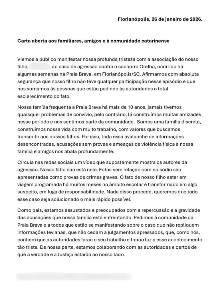 Três famílias de adolescentes citados nas investigações sobre a morte do cachorro Orelha, na Praia Brava, em Florianópolis, divulgaram comunicados negando qualquer participação de seus filhos no crime.