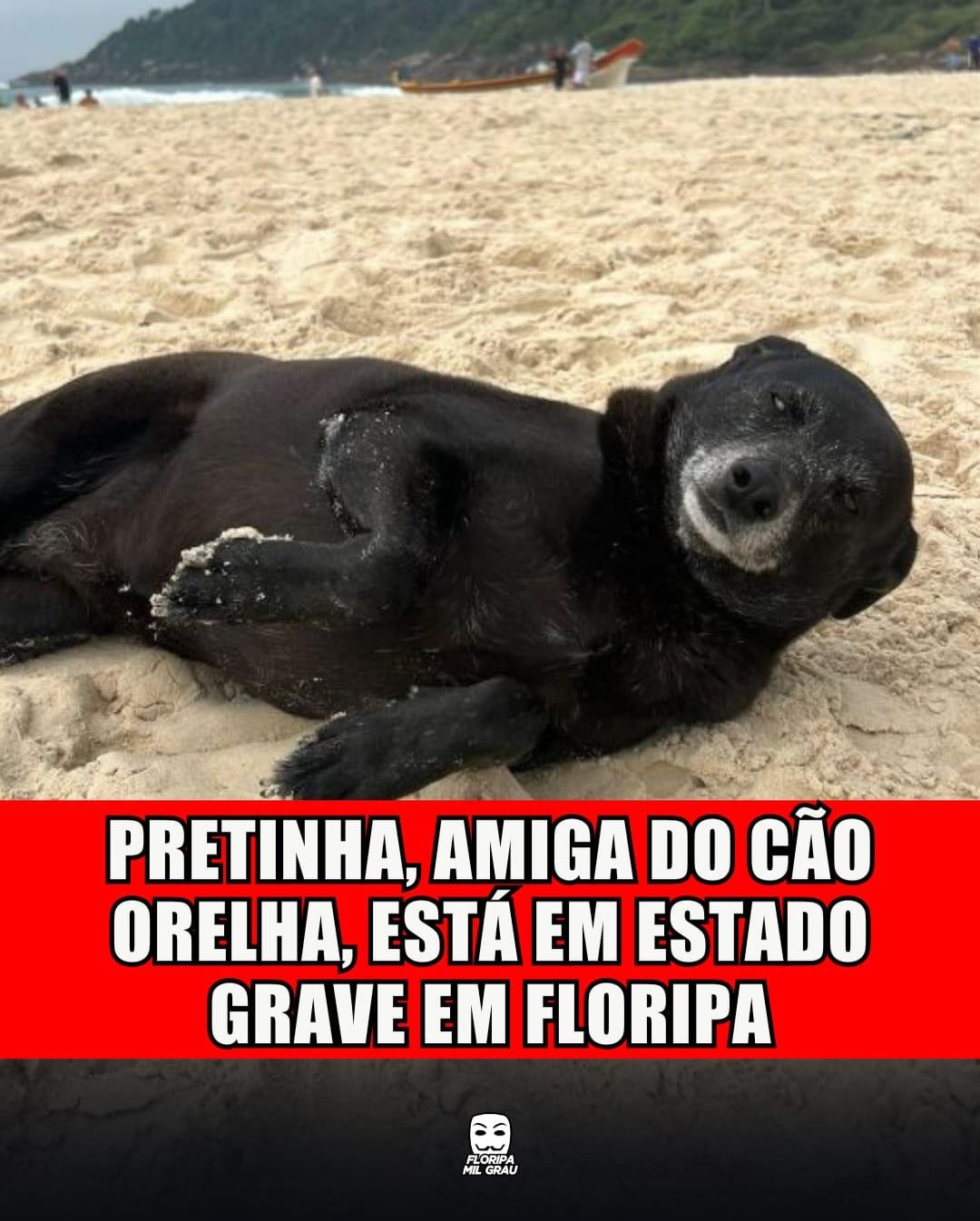Pretinha, bucica da Praia Brava que era amiga do Orelha, está internada em estado grave nesta segunda (26), em uma clínica de Floripa.