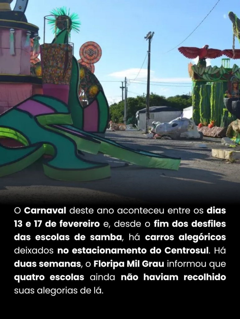 Os carros alegóricos que ocupam o pátio do CentroSul, em Floripa, estão próximos de deixar o local. Um acordo entre a Alesc e o Governo de SC vai liberar R$ 2 milhões para custear a operação de retirada total das estruturas. 📋