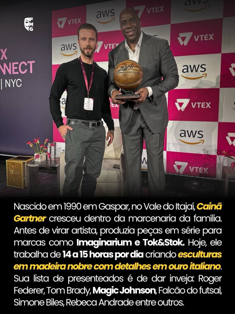 Natural de Gaspar e com ateliê em Balneário Camboriú, Cainã é da quarta geração de uma família de carpinteiros e já levou sua arte para nomes como Roger Federer, Andre Agassi, Tom Brady e a família Senna. 🪵