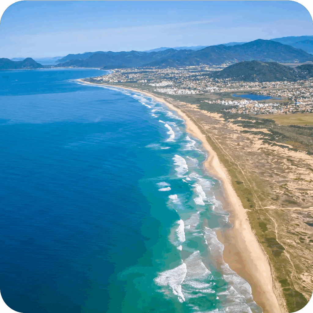 Sul 🌊 – O lado selvagem e preservado da ilha. Aqui estão paraísos como Lagoinha do Leste, Naufragados e Armação, onde a natureza mostra toda sua força em trilhas, vilas de pescadores e praias intocadas.